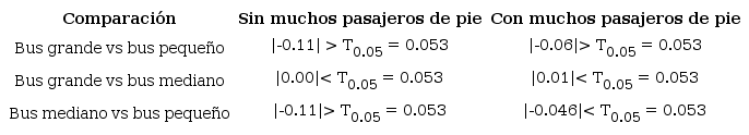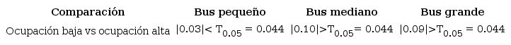 Donde T0.05 = 0.044 para los tipos de ocupación se obtienen las comparaciones por pares mostradas en la Tabla 8. Para este caso, la variable respuesta difiere significativamente en función de los niveles de ocupación para el bus mediano y bus grande, y no así para el bus pequeño.