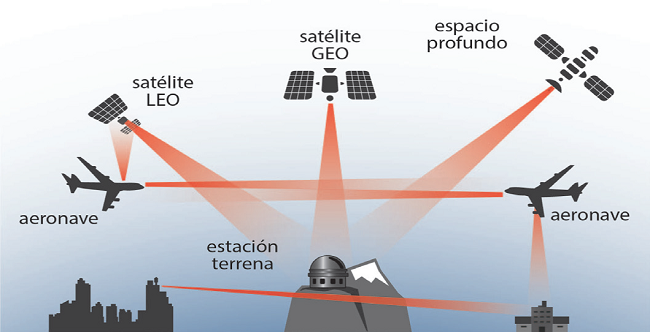 Los enlaces de comunicaciones ópticas espaciales (entre uno o varios satélites con una o varias estaciones terrenas) pueden realizarse a través de la atmósfera terrestre y el espacio exterior (Figura 1). En este tipo de enlaces se utilizan normalmente láseres como fuentes emisoras y etapas de fotodetección como elementos receptores requiriendo el uso de antenas ópticas (telescopios y lentes) tanto en la etapa transmisora como en la receptora (Figura 2). Una característica importante de los sistemas de comunicación óptica atmosférica es el requerir “línea de vista” para poder operar adecuadamente (Figura 1). Para lograr esta línea de vista se realiza en primer lugar la operación de apuntamiento y rastreo grueso entre transmisor y receptor, para lo cual pueden utilizarse las etapas de RF, GPS y sistema de actitud cuando son incluidas en la plataforma del satélite; las efemérides de la trayectoria satelital son entonces parte fundamental en la etapa de apuntamiento, rastreo y seguimiento inicial del sistema. Una vez que se consigue la línea de vista para establecer un enlace óptico satelital, se requiere un sistema de sincronización óptica espacial, también denominado sistema de apuntamiento, adquisición y rastreo (o ATP por sus siglas en inglés, Acquisition Tracking and Pointing), que usa comúnmente un haz óptico no modulado (faro óptico). Además, dado que dicho sistema debe operar en la atmósfera terrestre, su buen desempeño puede verse limitado por la atenuación del faro óptico ocasionada por la presencia de moléculas de gas y aerosoles (y en algunos casos, debido a la presencia de contaminantes) además de la turbulencia óptica (Andrews & Phillips, 2005), (Figura 3). Los sistemas de sincronización óptica espacial empleados para satélites medianos o de mayor tamaño, así como aquellos que se emplean en enlaces ópticos terrestres pueden ser considerados como una tecnología madura; sin embargo, la investigación y desarrollo tecnológico de dichos sistemas aún continúa a nivel internacional de forma importante, principalmente (aunque no exclusivamente) para enlaces de satélites de menores dimensiones tanto para comunicaciones clásicas como cuánticas (Chang et al., 2019; Rose et al., 2018; Abrahamson et al., 2015; Kaymak et al., 2018). Es en este último punto donde se encuadra el trabajo aquí presentado y en el contexto de un proyecto desarrollado con Fondos de la Agencia Espacial Mexicana.