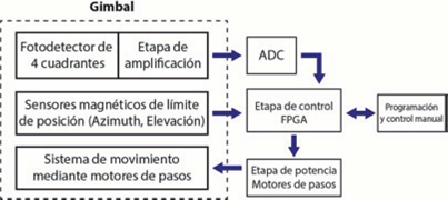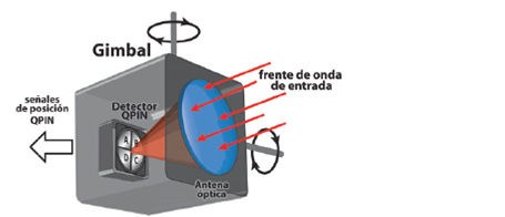 El mecanismo gimbal construido, es parecido en su funcionamiento a las monturas altazimutales de los telescopios astronómicos, cuya tarea es alinear el frente de onda entrante en el elemento ‹objetivo› para hacer coincidir la convergencia del haz hacia el centro del sistema detector. La alineación dinámica se lleva a cabo mediante la combinación de un elemento detector de posición de alta velocidad (QPIN) y de un sistema de control de movimiento del gimbal. El elemento detector es un fotodetector de 4 cuadrantes del que se habló anteriormente, este elemento en conjunto con una electrónica de adaptación, entrega señales eléctricas hacia un sistema mínimo que lee la posición del haz en el fotodetector y corrige la posición angular del gimbal utilizando un conjunto de motores de paso que mueven al gimbal. Como se mencionó anteriormente, existen dos tipos de fotodetectores de cuatro cuadrantes, QPIN y QAPD. Estos últimos tienen una muy alta sensitividad, pero agregan mayor ruido en la etapa de detección debido al efecto de avalancha, además requieren operarse con fuentes de alto voltaje complicando su implementación práctica. Así, en nuestro caso, es más conveniente utilizar un QPIN para el prototipo de laboratorio y enlaces atmosféricos terrestres, pues si usáramos un QAPD debido a su alta sensitividad se saturaría muy fácilmente debido al ruido ambiental residual.