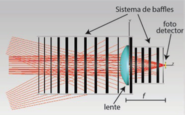 En la parte óptica se utilizó una lente plano-convexa como elemento convergente de 42 mm de apertura y 50 mm de distancia focal. Dado que la longitud de onda de trabajo es 980 nm es necesario utilizar filtros ópticos pasa banda para evitar saturar al fotodetector con señales ambientales de otra longitud de onda; esto, en conjunto con un sistema de ‘baffles’, evita que rayos ópticos que no provengan de la estación terrena se introduzcan en el gimbal y ocasionen falsas detecciones (Figura 11).