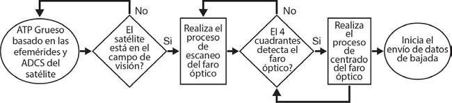 Un sistema de sincronización óptica espacial (ATP) está formado por tres subsistemas: de adquisición (Acquisition), de rastreo (Tracking) y de apuntamiento espacial (Pointing) de un haz óptico (Hemmati, 2006; Lambert & Casey, 1995). Generalmente se establece una secuencia determinada para llevar a cabo esta operación, por ejemplo (Arvizu et al., 2018):
