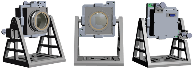 La parte mecánica se encargó de diseñar un sistema tipo gimbal con movimiento altazimutal que mediante un movimiento lineal de tornillos de ajuste fino modifique la posición angular del dispositivo mecánico en un ángulo sólido mayor a 8.9 ° (para este caso se eligió 10 °). El gimbal se fabricó en aluminio maquinado para obtener el menor peso posible.
