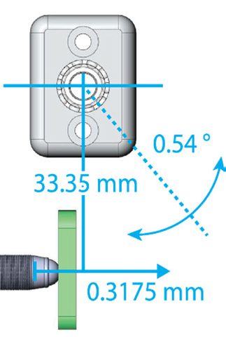 Para convertir el movimiento lineal de los tornillos de ajuste fino en desplazamiento angular en el eje X y Y, respectivamente, se tiene que al realizar una vuelta del tornillo de ajuste fino la caja del gimbal gira 0.545° en el eje correspondiente (Figura 17).