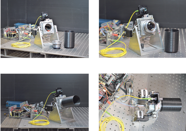 Abstract: In this paper, we report the development of a spatial optical synchronization system required in small satellites operating in low-earth orbit to establish an optical communication link between the satellite and an earth station. As a fundamental part of this system, we designed and implemented a precision gimbal with two degrees of freedom controlled by fine adjustment screws and an ad-hoc algorithm. We generate in the laboratory an artificial star using a laser source, monomode fiber and an astronomical telescope. Before that the satellite be eventually placed in orbit, it is possible to certify the good performance of our gimbal with respect to the tracking of an optical beacon using such artificial star in laboratory tests. We also report the characterization of the performance of our gimbal subsystem in atmospheric optical links. On the other hand, as a basis for this design, we took into account that prior to the acquisition of the optical beacon a coarse tracking process would be carried out through the RF, GPS and attitude system stages, which would be part of the platform of the satellite under design. Thus, the ephemerides of the satellite trajectory are a fundamental part in the process of acquisition, tracking, and initial pointing of the system. Due to the complexity of the system reported in this paper, the participation of specialists from various institutions such as CICESE, INAOE, Cetys Universidad campus Ensenada and the National Astronomic Observatory-UNAM in Ensenada, B.C., Mexico, was required. We developed the subsystems reported in this paper within the framework of a project with funds from the Mexican Space Agency.