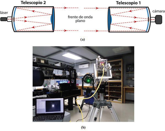 Dado que no es posible realizar pruebas satelitales de forma práctica se recurre a pruebas indirectas para caracterizar y optimizar la etapa óptica del sistema. Para un enlace satelital de larga distancia (> 500 km), un láser con un diámetro inicial de 2 mm y un ángulo de divergencia de 0.35 mrad, después de propagarse 500 km llegará con un diámetro de mancha del orden de 350 m. Debido a la enorme distancia de propagación del haz, el frente de onda que llega al gimbal puede considerarse como plano, por lo que esta condición debe replicarse en laboratorio para caracterizar y optimizar la etapa óptica. Para optimizar la etapa óptica del gimbal se realizaron pruebas experimentales usando la técnica de estrella artificial con el esquema mostrado en la Figura 23, con este método adicionalmente es posible obtener la escala de placa del sistema y utilizando una doble apertura en el telescopio receptor, es posible evaluar las condiciones de turbulencia al medir los centroides de las dos manchas recibidas en una cámara digital. De manera práctica, en el laboratorio se utilizó un láser visible de 532 nm (verde) como faro óptico para determinar la escala de placa del sistema óptico, dos telescopios Meade de 14’’ (LX200-ACF) y una cámara digital de alta velocidad (monocromática) adaptada al gimbal a la misma distancia en la que se coloca el fotodetector de cuatro cuadrantes.