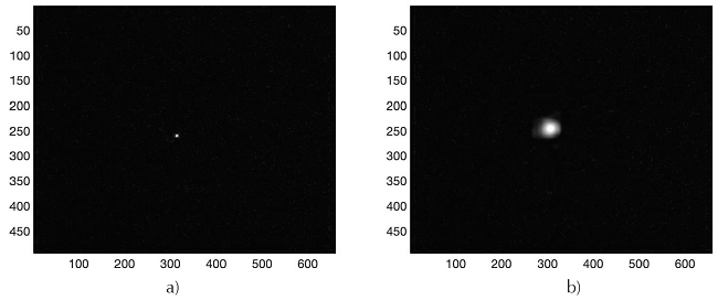 Cuando la estrella artificial está enfocada en el CCD de la cámara se observa un solo punto como en la Figura 22a, y cuando está desenfocada se observa una mancha (Figura 22b). La distancia focal efectiva del sistema se obtuvo de esta medición, resultando 49 mm. Con esta prueba también se determina la escala de placa, la cual resulto en 68.78 min arco/mm.