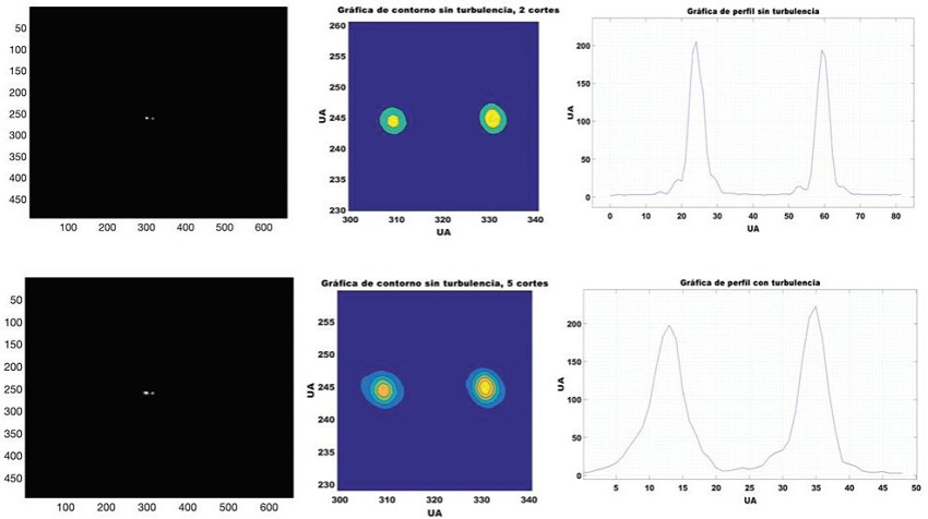 Una prueba adicional es la visualización de la estrella artificial con dos aperturas de diferente ángulo de convergencia. Para esta prueba se colocan en la entrada del telescopio receptor dos aperturas de igual tamaño, a una de estas se le coloca un prisma con un vidrio de espesor determinado, suficiente para lograr un camino óptico diferente (Figura 23). El resultado es una proyección de dos estrellas en el plano focal de telescopio receptor, donde se ubica la cámara digital. Las imágenes originales de las estrellas dobles y un análisis por computadora muestra cómo varía el ancho y la distancia de los centroides de las estrellas para imágenes sin y con turbulencia (Figura 24).
