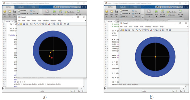 Como se ha descrito anteriormente, la señal del faro óptico debe incidir en el QPIN donde se realiza el proceso de centrado del mismo. Para llevar a cabo esta operación, como se mencionó arriba, se procesan las señales de los cuatro cuadrantes y se obtiene el azimuth y elevación del faro óptico en el detector y en caso de que el faro óptico no se encuentre en el centro, debe corregirse su posición mediante un sistema de motores retroalimentados en lazo cerrado. Adicionalmente al control de la posición angular es conveniente tener en el laboratorio una visualización de la ubicación del faro en el QPIN, para esto se diseñó un programa en Matlab que despliega dicha posición en tiempo real tal como se ilustra en las Figuras 25a y 25b. Así, con esta aplicación se puede observar el seguimiento y caracterización del movimiento angular del gimbal a través del tiempo.