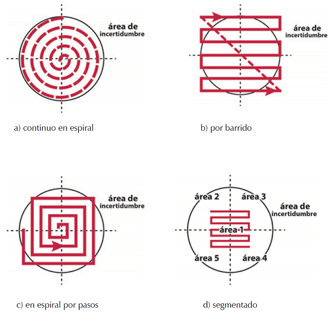 a) Continuo en espiral: Es la técnica más eficiente para cubrir el área de incertidumbre. El ancho de la espiral estará determinado por la divergencia del haz y el área de incertidumbre (Figura 8a). Las ecuaciones para este rastreo son: