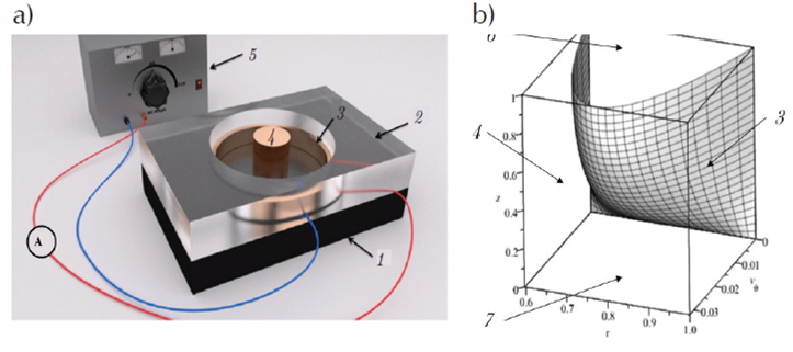 A través del modelado matemático se puede simular en tres dimensiones el comportamiento del fluido en el canal abierto. Se puede experimentar con distintas configuraciones donde varíe la profundidad del canal, la relación entre los radios de los electrodos y las magnitudes de los campos magnéticos y eléctricos. En la Figura 2a se muestra el mezclador MHD propuesto, donde 1 es el imán permanente de neodimio; 2 es un contenedor de resina, que contribuye con la base del canal, y donde se instalan los electrodos; 3 es el electrodo exterior; 4 es el electrodo interior; 5 es la fuente de voltaje y A es un amperímetro para medir la corriente que fluye a través de los electrodos. En la Figura 2b se muestra la simulación (a partir del modelado matemático) de un corte transversal del canal MHD propuesto: , , y . Donde 3 es el electrodo exterior; 4 es el electrodo interior; 6 es la superficie libre y 7 es la base del canal.