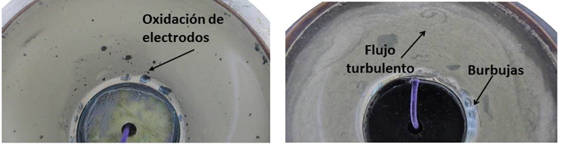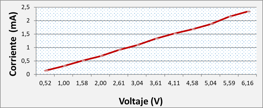 Para la selección de la composición de la solución micro-fluídica se analizaron cinco configuraciones (Tabla 1) en busca de aquellas soluciones que permitieran el flujo de corriente a través de dicha solución con un comportamiento Voltaje-Corriente (V-I) lineal y con un comportamiento del flujo en estado estable (no caótico, ni con presencia de vértices). Durante la experimentación se observó que con una concentración de Bicarbonato de Sodio de 1 M con o sin esferas de vidrio huecas recubiertas de plata (S-HGS, por sus siglas en inglés), se obtenía un flujo caótico, mientras que con una concentración de Bicarbonato de Sodio de 0.1 M el flujo era estable, pero los electrodos se oxidaban y se generaban burbujas (Figura 3). También se observó que al agregar esfera S-HGS a la solución aumentaba su conductividad y, consecuentemente, la velocidad convirtiéndose en flujo turbulento, el cual no es una característica de los micro-fluidos en general. De esta manera, se concluyó que la mejor opción fue utilizar solo agua destilada con esferas S-HGS, ya que esta solución provee de conductividad, de una relación lineal V-I (Figura 4) de un flujo estable y no se presentan problemas de oxidación ni de burbujas. Se concluyó que el mejor rango de operación estaba presente de 0.5V a 6V.