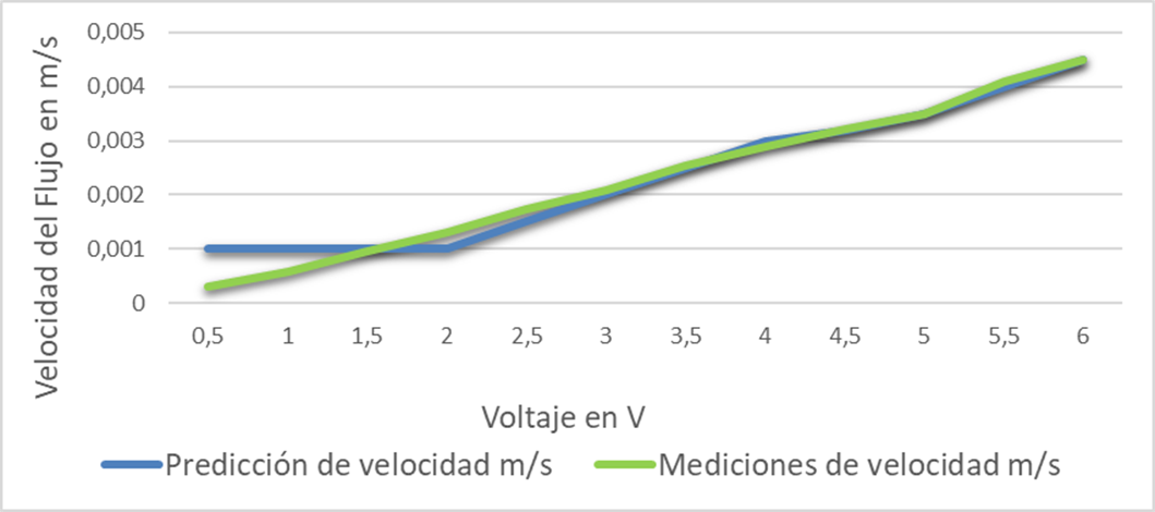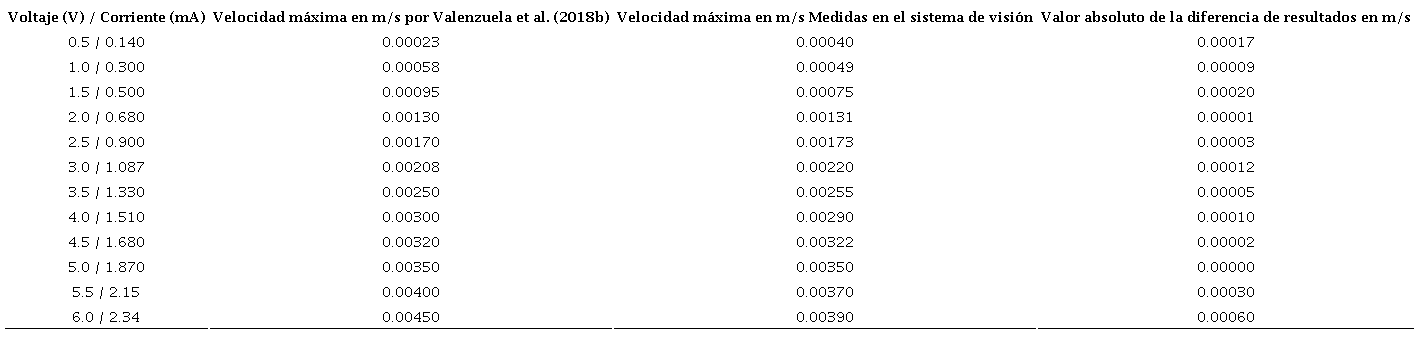 Se partió de la preparación de las soluciones conductoras mostradas en la Tabla 1. Se prosiguió con el llenado del canal anular hasta la profundidad definida , se indujo la fuerza de Lorentz debido a la presencia del campo magnético y del encendido de la fuente de voltaje directo. Se realizó la caracterización eléctrica V-I de las distintas configuraciones de soluciones conductoras mostradas en la Tabla 1 y se observó el comportamiento del fluido. Para la configuración 1, no se observó movimiento del fluido. En la configuración 2 se observó un flujo turbulento y la generación de burbujas. Para las configuraciones 3 y 4 la conductividad era tan alta que el flujo fue de alta velocidad y turbulento. Tras estos experimentos fue notorio que al agregar las esferas S-HGS la conductividad aumentaba, por lo que se decidió probar la configuración 5, que mostró un flujo estable, sin burbujas ni problemas de oxidación, y con una relación V-I lineal como se muestra en la Figura 4. Después se procedio a la validación experimental preliminar, donde se compararon las predicciones del modelo matemático contra las lecturas obtenidas a traves del sistema de visión diseñado para analizar el mezclador MHD, como se muestra en la Figura 5 y se describe en la Tabla 6. Donde se obtuvo una variación máxima de 0.00060 m/s.