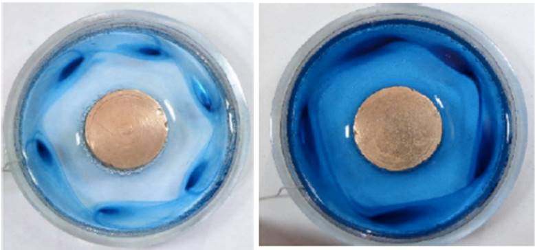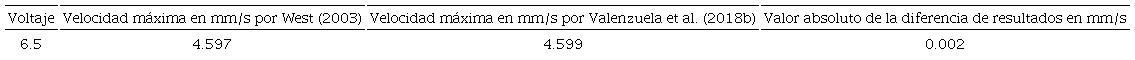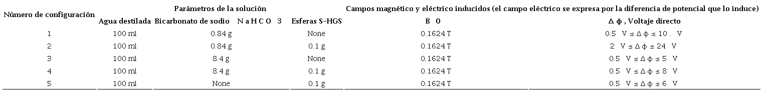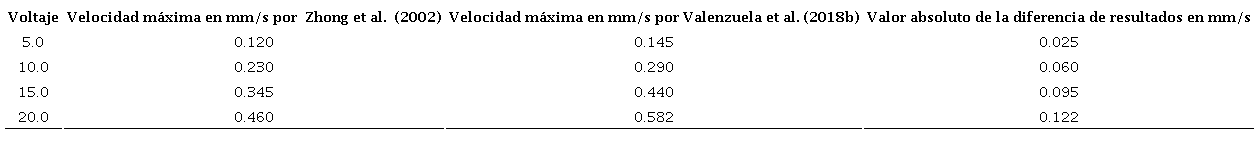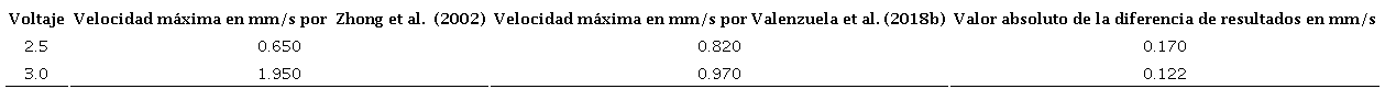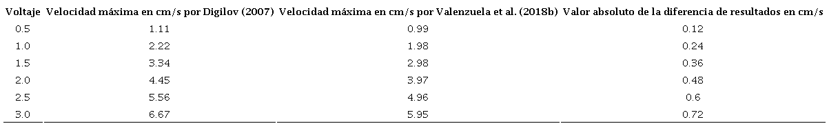 La experimentación comparada es la de un canal anular con una profundidad , con radio interior , con radio exterior , con relaciones y En la Tabla 4 se muestran los resultados obtenidos al utilizar agua desionizada con una conductividad . En la Tabla 5 se muestran los resultados obtenidos al utilizar una solución salina con una conductividad . En ambas experimentaciones se indujo un campo magnético , y una fuente de voltaje dc variable , donde se observó una variación de 0.025 a 0.170 mm/s ente los dos modelos.