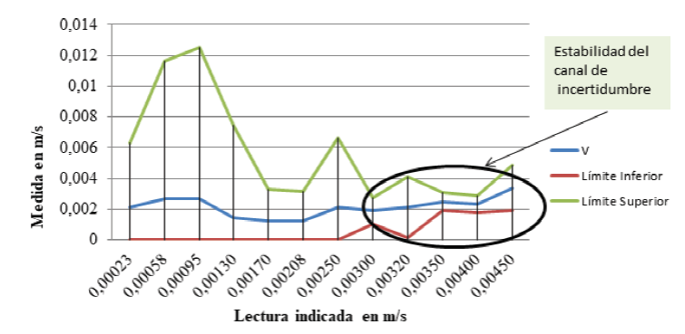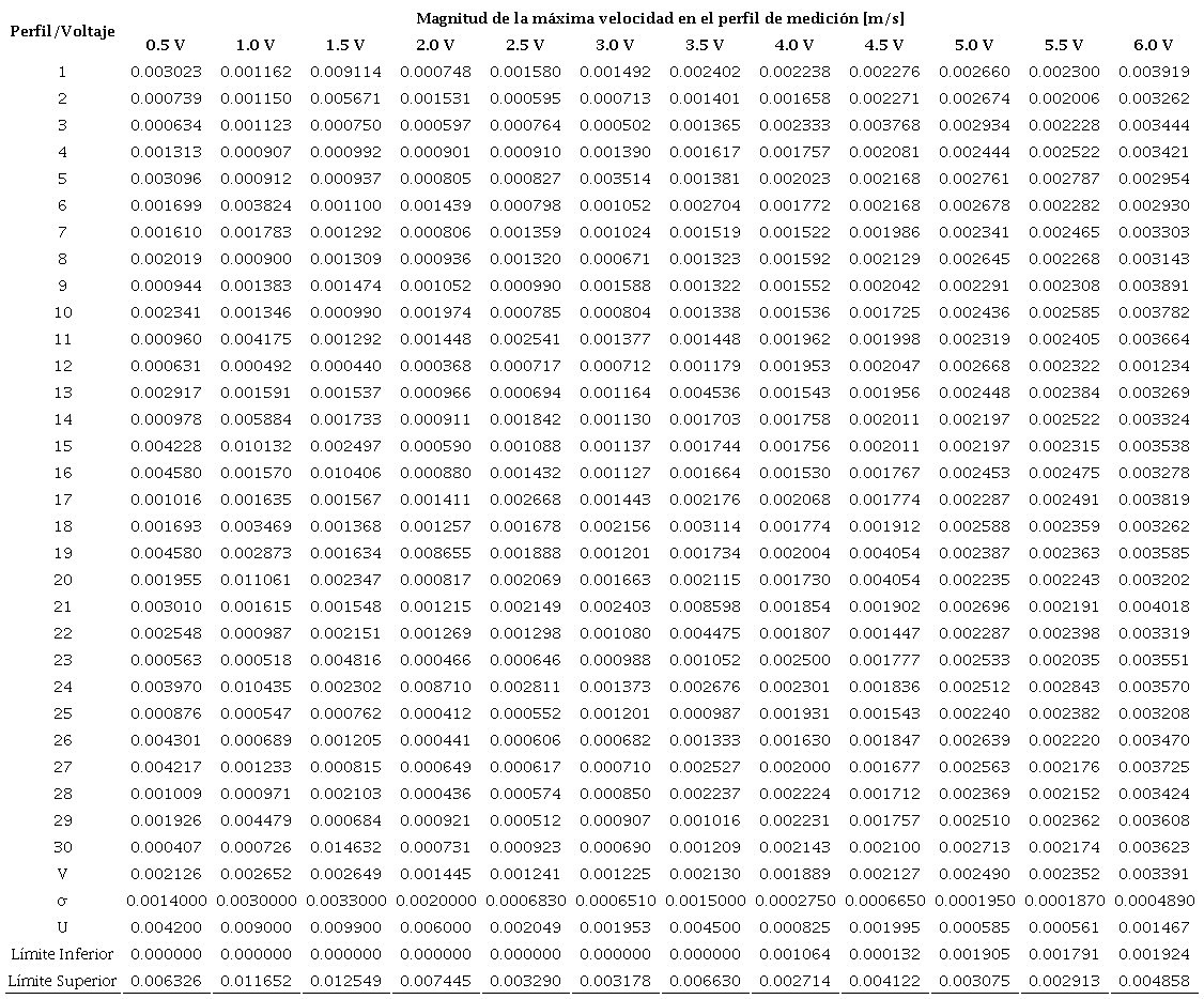 Para cada nivel de voltaje aplicado (de 0.5 V a 6.0 V) al mezclador MHD se le aplicó la medición de 30 perfiles de velocidad distribuidos en 3 cuadrantes. Se estimó la incertidumbre de medida de acuerdo con (31) para cada uno de estos niveles de voltaje a un nivel de confianza de 99 %, donde k=3 es el factor de cobertura, debido a que los datos presentan una distribución normal y es la desviación estándar de la distribución de datos. De manera que la estimación de medida se define por (32), donde es la media aritmética de los datos (Ramón, 2006). Se obtuvo la gráfica de calibración mostrada en la Figura 8 de acuerdo con los datos de la Tabla 7. Donde se puede observar que el canal de incertidumbre para las mediciones se vuelve regular a partir de mediciones de velocidad mayores a 0.003 m/s, para lo cual se estimó una incertidumbre de medición de ±0.001152 m/s para perfiles de medición con comportamiento de velocidad estables, a partir del promedio de las incertidumbres ( obtenidas de las mediciones de los perfiles de velocidad con diferencias de potencial de 4.0, 4.5, 5.0, 5.55, y 6.0 volts.