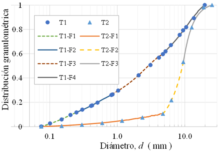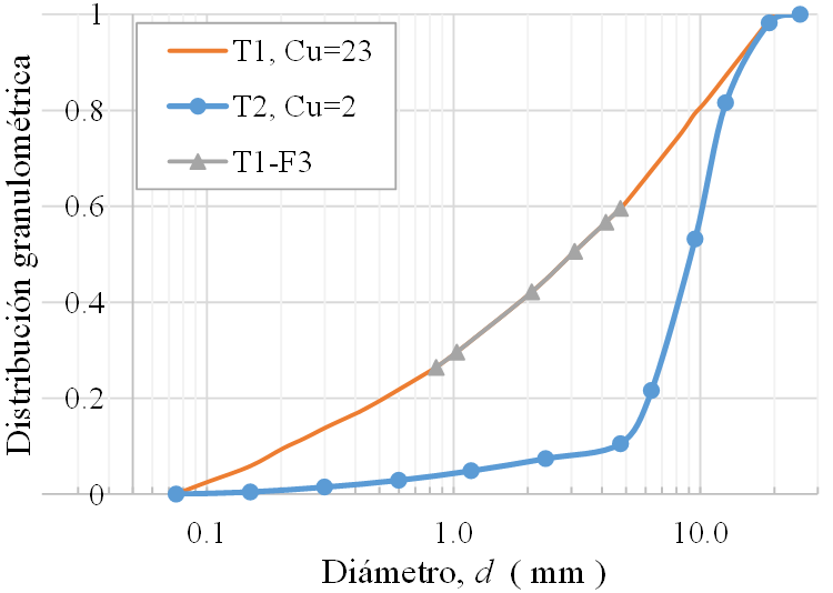El tezontle disponible en los bancos de préstamo de la Ciudad de México, puede presentar granulometrías muy variadas, desde bien graduadas con coeficiente de uniformidad Cu=23 (T1 en la Figura 1) hasta mal graduadas con Cu=2 (T2 en la Figura 1). El material T1-F3 de la Figura 1 es una fracción granulométrica del tezontle bien graduado, de interés en el siguiente apartado de este trabajo.