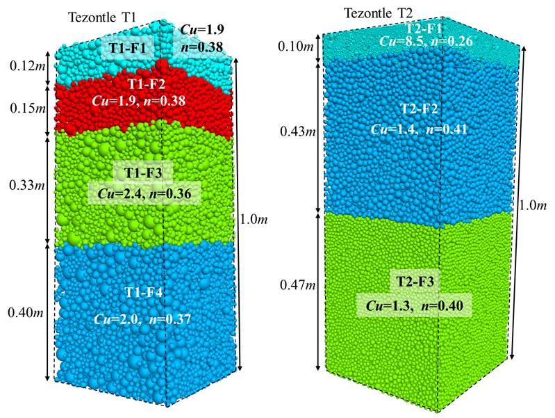 La Figura 10 presenta simulaciones de dos calas representativas de terraplenes ligeros construidos con los tezontles analizados en esta investigación. Se usa un factor de escala para aumentar el tamaño de los granos; lo anterior permite reducir el número de partículas y disminuir el tiempo de cómputo sin alterar la granulometría.