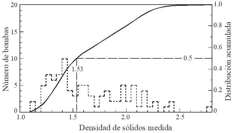 Para evaluar la densidad de los granos de escoria, McGetchin et al. (1974) colectaron 94 bombas de tamaño comprendido entre 0.1 y 0.3 m producidas por la erupción del Monte Etna, Italia. Cada fragmento se sumergió en parafina para sellar su superficie. La densidad de cada bomba se obtuvo por inmersión en agua, corrigiendo por volumen y peso de la parafina en cada caso. El intervalo de valores obtenidos fue [1.2, 2.8] como se observa en la Figura 2. Un 50 % de los fragmentos presentaron densidades comprendidas en el intervalo [1.35, 1.92]. La mediana de la densidad de las bombas resultó de 1.53.