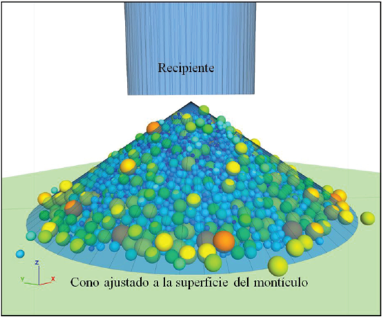 Tomando en cuenta lo anterior, se realiza un análisis de sensibilidad colocando una muestra granular con una granulometría relativamente uniforme dentro de un recipiente cilíndrico. Se proponen pares de valores μf , μr y, el recipiente se desplaza hacia arriba para que el material granular forme un montículo (de acuerdo con la metodología sugerida por Itasca (2015). En cada caso se calcula el ángulo de reposo del montículo resultante. La Figura 3 presenta el montículo obtenido por simulación correspondiente a μf =0.7 y μr =0.5.
