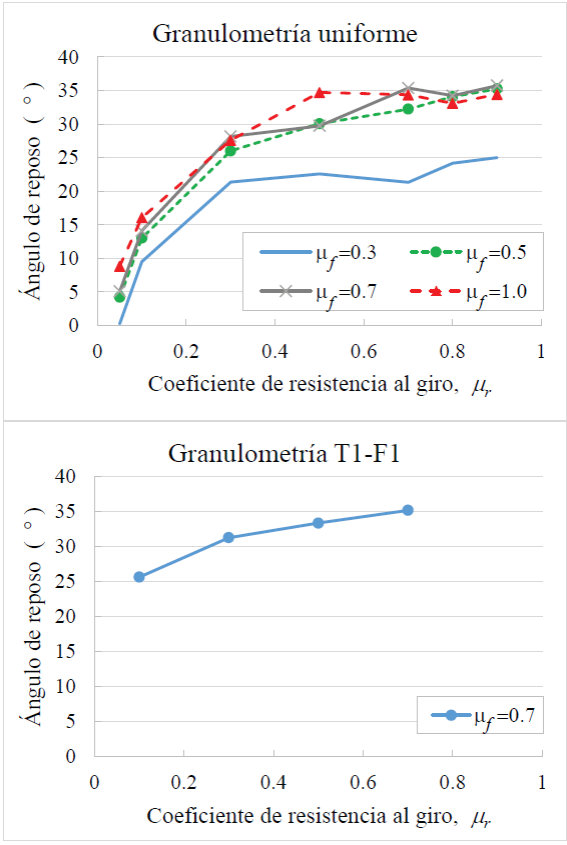 En las simulaciones numéricas realizadas se consideró como representativo un modelo de contacto lineal con resistencia al giro. En este, el coeficiente de fricción, μf , se asocia a la aspereza de la superficie, y el coeficiente de resistencia al giro, μr , se relaciona con la angulosidad de los granos.