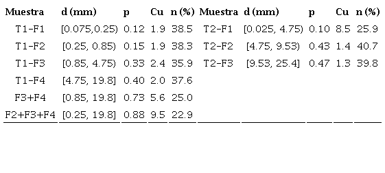 La Tabla 1 presenta la porosidad medida en las muestras granulares de acuerdo con el párrafo anterior. La porosidad de las fracciones granulométricas uniformes es claramente mayor que la de las fracciones granulométricas mejor graduadas como F3+F4, F2+F3+F4 y T2-F1.