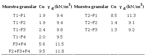 Para las muestras de tezontle simuladas, la Tabla 2 presenta el peso volumétrico seco, γd , que se calcula con la expresión 1.
