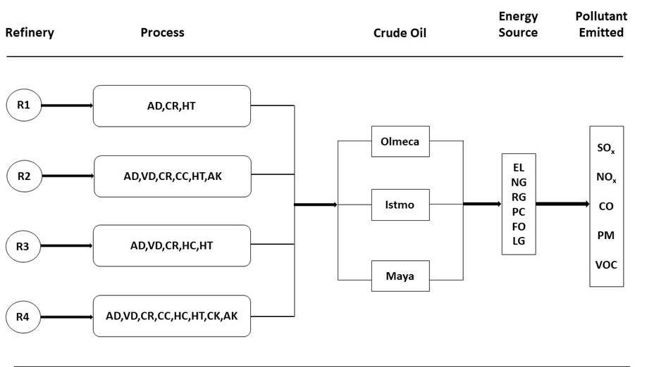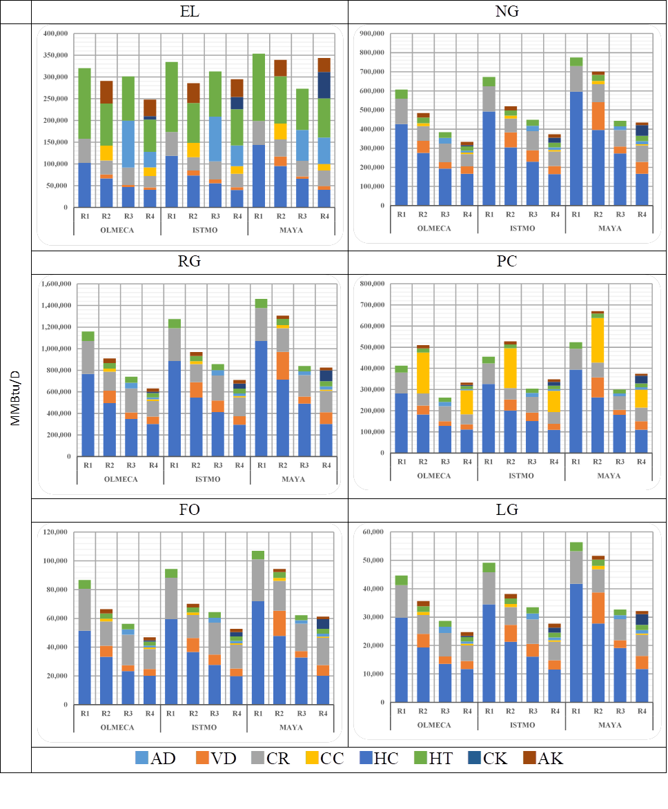 Different projections were determined by modeling four types of refineries (R1 “hydroskimming”, R2 “cracking”, R3 “hydrocracking” and R4 “full conversion”), three types of crudes (Olmeca, Istmo and Maya), and eight types of processes (AD “atmospheric distillation”, VD “vacuum distillation”, CR “catalytic reformation”, CC “catalytic cracking”, HC “hydrocracking”, HT “hydrotreatment”, CK “coking”, AK “alkilation”).