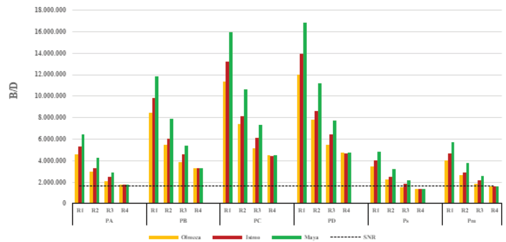 The figure clearly shows how the required crude volumes for three of the six projections exceeds, by much, the planned volumes that will be sent to the national refinery system NRS (SENER, 2016) (dotted line). Only the scenario based on the vehicular growth tendency (PA), the one suggested by the Mexican Department of Energy (Ps), and the one modeled by the Montecarlo program (Pm), almost completely agree for a very complex refinery (R4) and for the three types of crude.