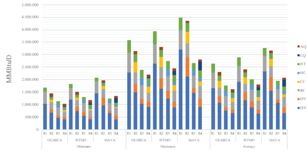 Figure 3 show at first glance, it can be seen that the process that uses the most energy is atmospheric distillation (AD) regardless of the type of analyzed projection. It can also be seen that, regardless of the minima, maxima or average values, the use of Maya crude implies a higher energy consumption in very complex refineries (R4) relative to the complex ones (R3).