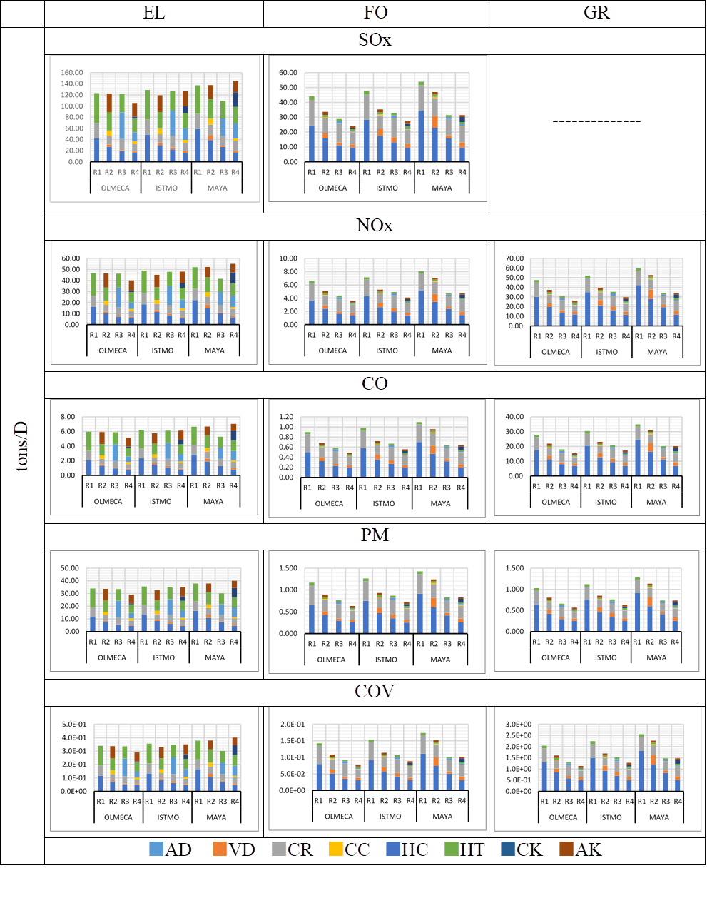Figure 5 show the emissions by type of analyzed pollutant for three energy sources (EL, FO and RG) at the different types of refineries, types of crudes and processes studied, considering an energy consumption average.