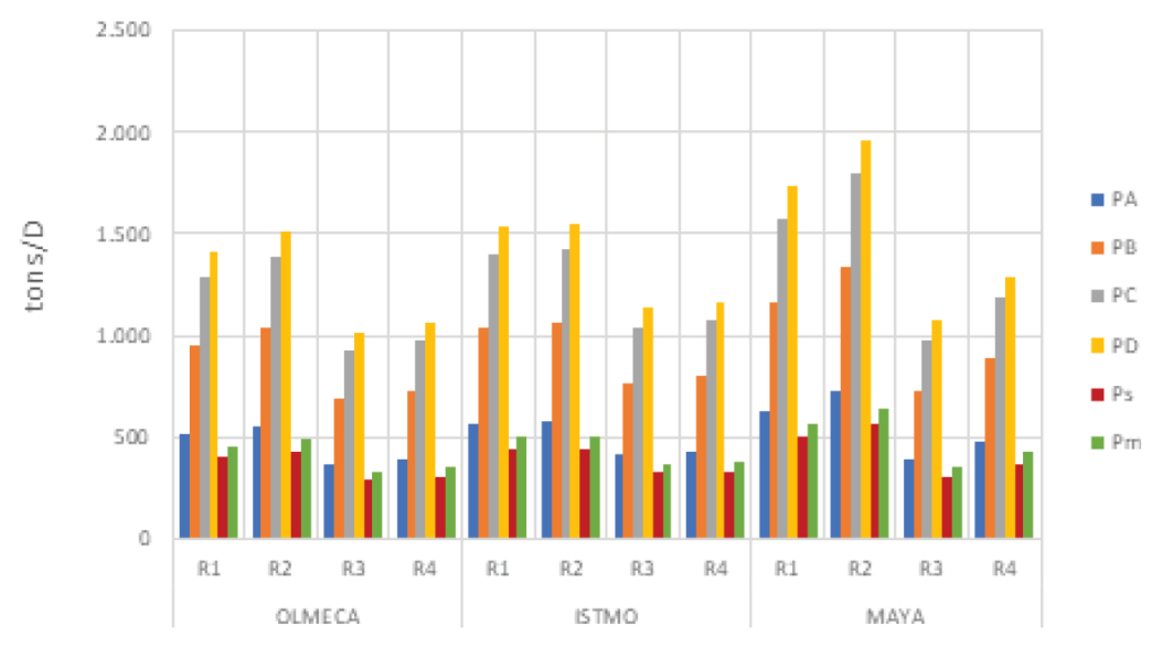 In Figure 6 it can be seen that regardless of the analyzed projection, refinery R3 processing Olmeca crude has the lower emissions and that R2 processing Maya crude has the highest, with a difference, in ton/day, of 350 for PA, 648 (PB), 870 (PC), 952 (PD), 273 (Ps) and 310 (Pm).