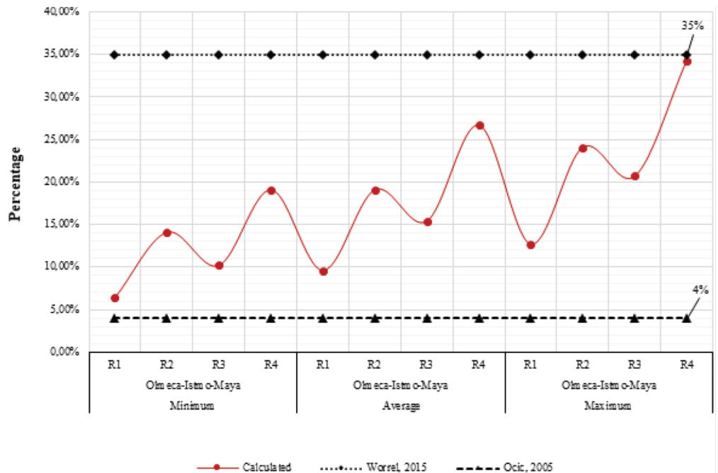 This figure shows that the calculated data for the equivalent energy consumption relative to the total processed crude is within the lower interval of the reference data cited by Szklo, 2005 (4 %), and within the highest reference as calculated with the data EPA, 2015 (35 %). Therefore, in analysis of the minimum energy consumption, the calculated interval lies between 6.4 % and 19.1 %, an average consumption between 9.6 % and 26.7 %, and a maximum consumption 12.7 % and 34.3 %. Additionally, an R4 refinery shows the highest equivalent energy consumption and an R1 refinery shows the lowest.