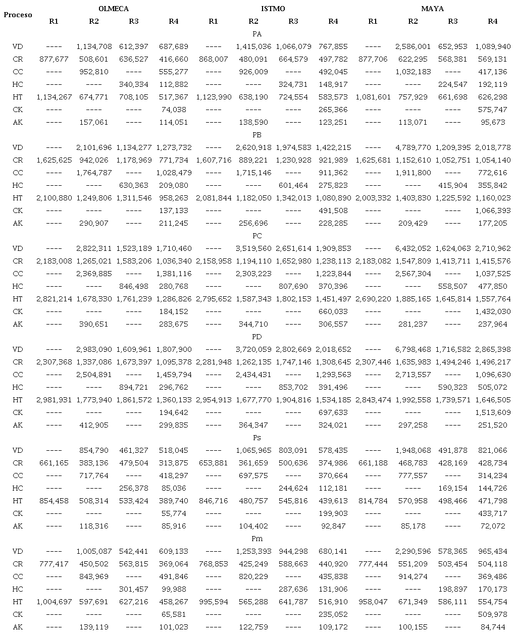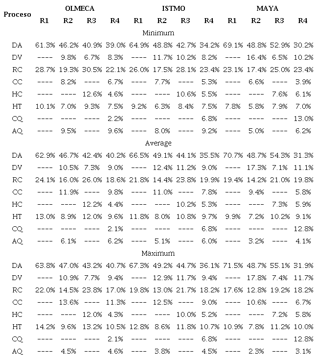 Based on Table 7, the carrying capacity minima and maxima for the different analyzed processes are obtained when using one type of refinery and crude as follows: VD (R3-olmeca, R2-maya), CR (R4-olmeca, R1-maya), CC (R4-maya, R2-maya), HC (R4-olmeca, R3-olmeca), HT (R4-olmeca, R1-olmeca), CK (R4-olmeca, R4-maya) and AK (R4-maya, R2-olmeca).