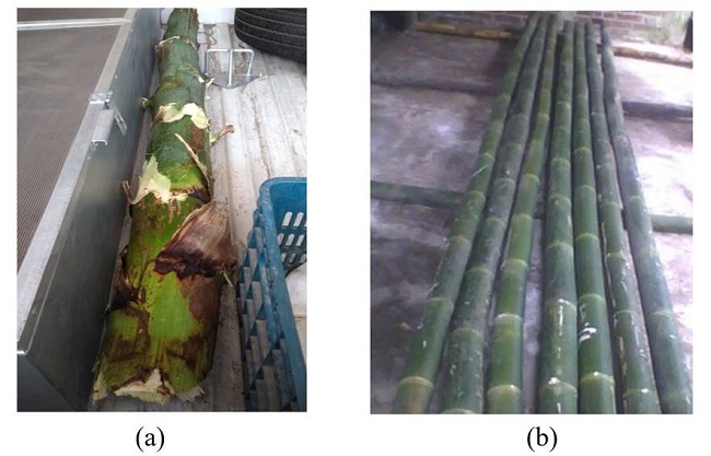En México, el bambú de mayor uso es de la especie Guadua, el cual se produce en la región de Veracruz (Dávila et al., 2012). Esta especie de bambú ha sido sometida a diferentes estudios, donde se destacan sus propiedades a tracción, compresión, corte y flexión (López & Correal, 2009; Estrada, 2010; Osorio et al., 2010). En la Figura 1, se aprecia el bambú Guadua cortado y seco.