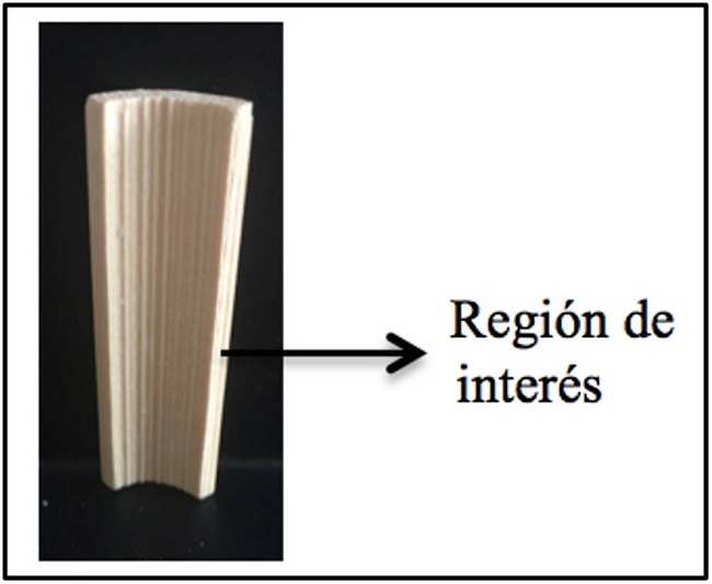 Las probetas se maquinaron de tal forma que las fibras fueran paralelas a la dirección de la carga y que la zona de trabajo fuese la región intermedia de las caras del tallo (cámbium y duramen), por consiguiente, las pruebas realizadas en este trabajo no consideran las fibras exteriores ni interiores del tallo. Es importante mencionar que las regiones del Quiote y bambú utilizadas para fabricar las probetas fueron aquellas desprovistas de nudos (o entre-nudos), es decir, las fracciones centrales del tallo (Figura 7).