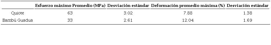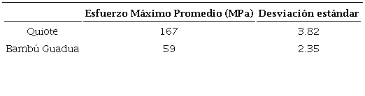 De los resultados de la Tabla 2, se puede apreciar que el Quiote presenta un valor de esfuerzo máximo de flexión 2.83 veces mayor que el del bambú, lo que sugiere que este tipo de pedúnculo presenta mejores propiedades mecánicas en condiciones de flexión pura. Por otra parte, la Tabla 3 indica un valor de esfuerzo máximo de tracción mayor para el Quiote respecto al bambú (2 veces más). Sin embargo, en el caso de la deformación se puede observar que el bambú presenta mejores cualidades (1.52 veces más).