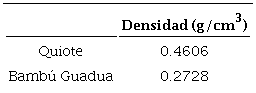 La Tabla 4, muestra los valores promedio del módulo de flexión, donde se indica que el del Quiote es 2.04 veces superior al del bambú Guadua, tal y como se observa en el comportamiento gráfico de la Figura 9.