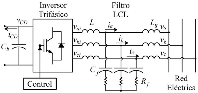 El filtro LCL mostrado en la Figura 1, se utiliza como interfaz en la interconexión de un sistema con inversor trifásico y la red eléctrica. El filtro LCL se caracteriza por agregar dinámica al sistema que se interconecta con la red eléctrica, además de reducir la distorsión armónica en las corrientes producidas por la operación del inversor, en donde los IGBT’s conmutan a alta frecuencia mediante la técnica de modulación por ancho de pulso en el espacio vectorial (SVPWM). Los valores de los parámetros del filtro LCL se establecen de acuerdo con el flujo de potencia activa nominal en el sistema, el voltaje entre líneas de la red eléctrica y la frecuencia de conmutación de los IGBT’s. Para determinar el valor de la inductancia del filtro LCL, lado del inversor, se considera al voltaje de la red eléctrica como un cortocircuito para altas frecuencias y se utiliza la siguiente función de transferencia de primer orden a la frecuencia de conmutación (Liserre et al., 2005):
