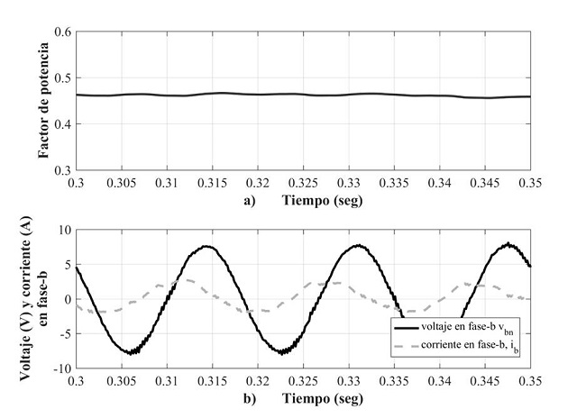 En la Figura 10 se muestra el factor de potencia en adelanto del STATCOM, en donde la corriente tiene un adelanto de 64.67° respecto al voltaje, ambos de la fase b, estableciendo un factor de potencia de 0.46, como consecuencia de los 300 VAr’s que se entregan a la red eléctrica y del flujo de potencia activa que alimenta al motor de inducción. En la Figura 11 se muestran las corrientes y los voltajes de línea a línea vab y vcb, en la red eléctrica, señales que son sensadas para la operación del sistema de control del STATCOM.