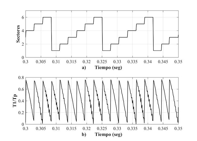 En la Figura 12 se muestra el desempeño del acondicionamiento de las señales de control vdi y vqi, utilizando la técnica de modulación de ancho de pulso en el espacio vectorial. En la Figura 12a se muestran los sectores que va abarcando el vector de voltaje resultante que gira a la frecuencia de la red eléctrica, conforme a la secuencia de combinaciones de bits para la activación de los IGBT’s descritos en la Sección IV. En la Figura 12b se muestra el índice de modulación del inversor trifásico tipo puente de 0.76, el cual corresponde a la relación del tiempo de activación T1 de un transistor con el tiempo de muestreo Tp.