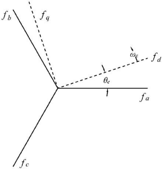 donde la componente de la señal eléctrica en el eje directo fd corresponde a la amplitud de la señal por fase Fm y es una señal de directa, sin frecuencia. Por otro lado, la componente en el eje en cuadratura fq resulta del producto del segundo renglón de la matriz de transformación y el vector de una señal del sistema trifásico, obteniéndose: