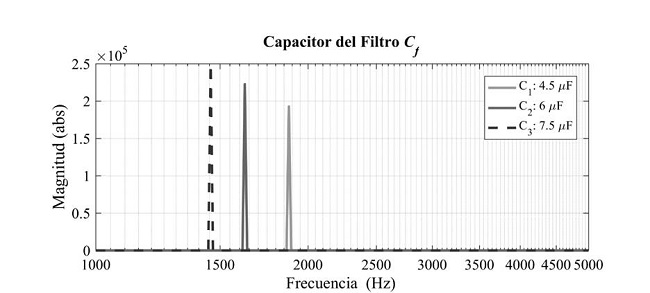 al realizar el análisis en frecuencia en el rango de 1 kHz a 5 kHz y utilizando la función de transferencia del filtro LCL (14) con tres valores de capacitancia: 4.5, 6.0 y 7.5 μF, se seleccionó el valor de 7.5 μF, el cual tiene una menor frecuencia de resonancia de 1.46 kHz, ver Figura 3.
