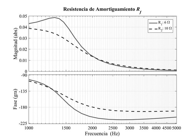 del análisis en frecuencia de (16) y utilizando el diagrama de Bode, se selecciona el valor de resistencia que presenta la mejor respuesta, es decir, donde se presente una respuesta suave de la ganancia sin sobreimpulso. El valor inicial de la resistencia de amortiguamiento Rf se calculó en 6.2 Ω utilizando (15); al realizar el análisis en frecuencia en el rango de 1 kHz a 5 kHz utilizando la función de transferencia del filtro LCL completo (16) con dos valores de resistencia: 6 y 10 Ω, se seleccionó el valor de 10 Ω, valor con el cual el filtro tiene una mejor respuesta dinámica en frecuencia con una amortiguación de 0.03 de la corriente a la frecuencia de resonancia de 1.46 kHz, como se muestra en la Figura 4.