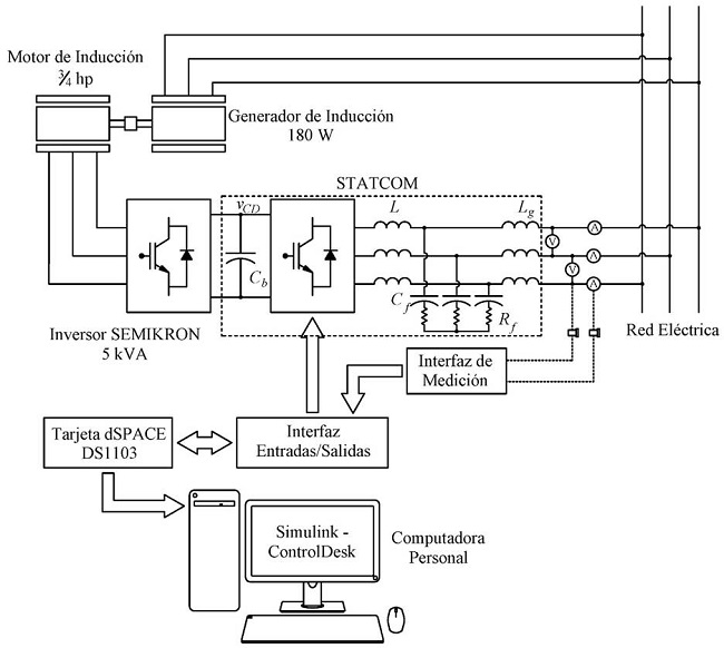 El voltaje del sistema de alimentación trifásico es de 220 V de línea a línea, la potencia nominal del sistema es de 1.5 kW, el voltaje del bus de CD de 270 V, el banco de capacitores es de 4200 μF, el motor de inducción es de 3/4 hp. Se sensan dos voltajes de línea a línea y las corrientes en las tres fases de la red eléctrica, además de sensar el voltaje del bus de CD y la corriente en CD entre los dos inversores; estas señales sensadas son utilizadas en el sistema de control del STATCOM. El flujo de potencia activa se realiza mediante un segundo inversor trifásico tipo puente conectado al bus de CD y que alimenta a un motor de inducción jaula de ardilla, marca Baldor M3112 de 3/4 de hp, el cual se acopla mecánicamente con un generador de inducción, marca Lab-Volt 8231-03, para establecer los cambios del par de carga del motor.