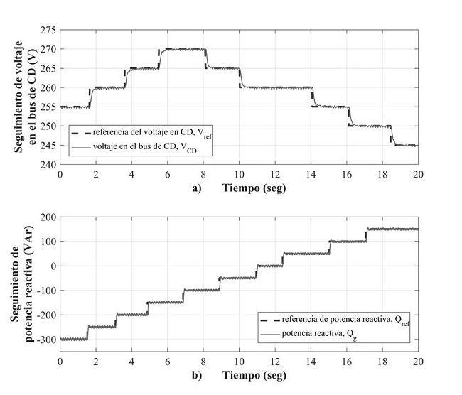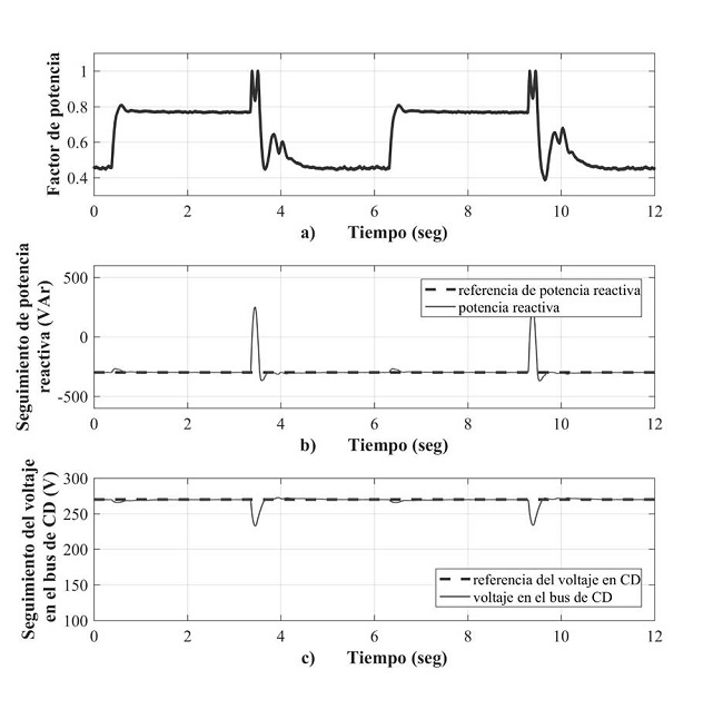 En la Figura 7a se muestran los cambios en el factor de potencia de 0.42 a 0.78 debido a los cambios en la potencia activa, puesto que la potencia reactiva se mantiene regulada en 300 VAr’s, como puede observarse en la Figura 7b, en donde se presenta un sobre impulso de potencia reactiva de 183 % con una duración de 0.35 s, cuando la potencia activa baja, y un sobre impulso de 181 % con una duración de 0.4 s, cuando la potencia activa sube. En la Figura 7c se muestra la robustez en la regulación de voltaje del bus de CD en 270 V, en donde se presenta un sobreimpulso hacia abajo de 13 % con una duración de 0.32 s, cuando se presentan cambios en la potencia activa.