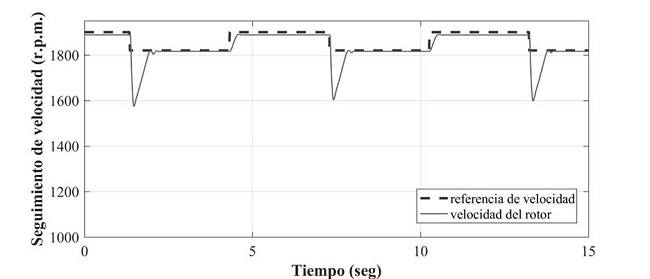 En la Figura 7 se muestra el desempeño del sistema de control del STATCOM en presencia de perturbaciones externas, las cuales son originadas por cambios súbitos en escalón de la potencia activa, al cambiar las condiciones de carga de un motor de inducción. Las perturbaciones externas se originan debido al seguimiento de un tren de pulsos de velocidad de 1820 a 1900 r.p.m. (Figura 8) por parte de un motor de inducción que está acoplado mecánicamente con un generador de inducción, el cual se conecta directamente a la red eléctrica. Con el seguimiento del tren de pulsos por parte del motor, se originan cambios súbitos en la velocidad de deslizamiento y, en consecuencia, se presentan cambios súbitos en el par de carga (par electromagnético del generador) y en el flujo de potencia activa que se entrega a la red eléctrica. A la velocidad de 1820 r.p.m. se presenta el flujo mínimo de potencia activa, mientras que a la velocidad de 1900 r.p.m. se presenta el flujo máximo de potencia.