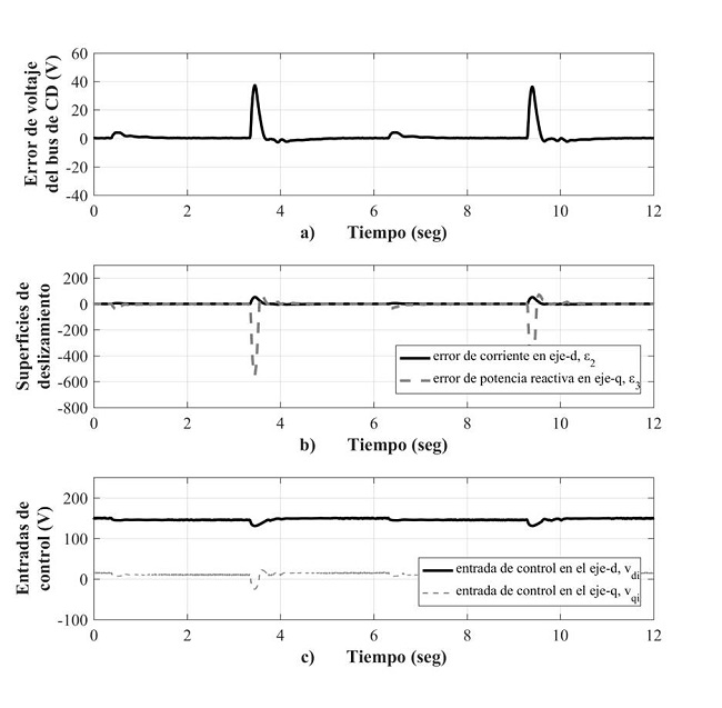 En la Figura 9 se muestran las acciones de control vd y vq del STATCOM. La ley de control super-twisting (20) en el eje d, vd, con un valor de 150 V (Figura 9c) obliga a que se desvanezca la superficie de deslizamiento s2 a cero en tiempo finito cuando se presenta una perturbación (Figura 9b), logrando un movimiento asintótico hacia cero del error de voltaje del bus de CD (Figura 9a). Por otro lado, la acción de control en el eje q, vq, aplicando el algoritmo super-twisting, con un valor de 10 V (Figura 9c), forza directamente el movimiento hacia cero de la superficie s3 (Figura 9a), logrando directamente la regulación de la potencia reactiva en 300 VAr’s que se entregan a la red eléctrica.