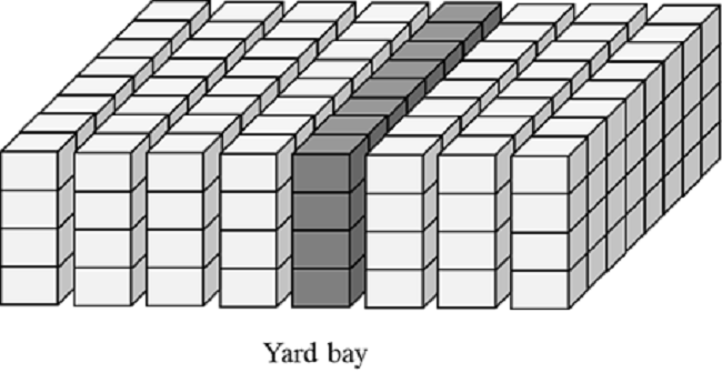 Container terminals are areas where containers are temporarily stored while waiting for maritime or land transportation. The storage yard consists of several areas perpendicular or parallel to the berth called blocks. Each block is composed of several bays that represent the length of the block, several rows which represent its width and by some tiers which represent its height (Figure 1).
