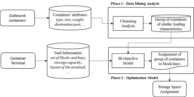 To address the problem depicted above, this paper proposes a two-phase hierarchical approach that combines a clustering technique and an operational research model. Figure 2 details the proposed approach. The first phase groups outbound containers of each vessel into clusters of similar loading characteristics (in order to load them consecutively). The resulting groups are the input to the bi-objective storage space assignment model, which determines the ideal assignment of groups of containers to block-bays as output.