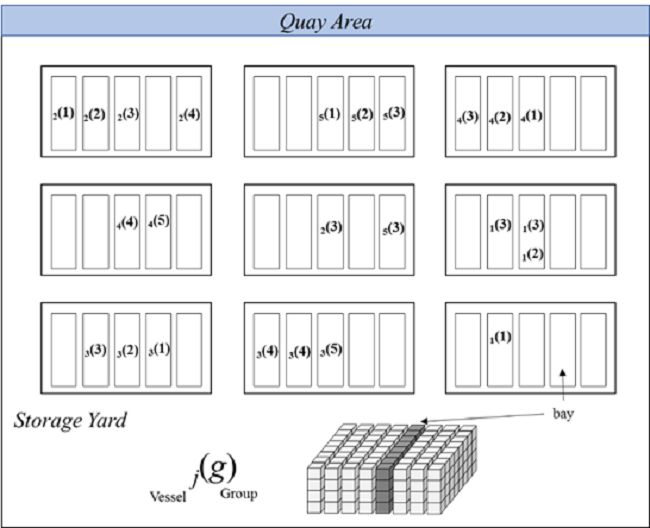 For the management of outbound containers, whenever a vessel is scheduled to arrive at a terminal, the container terminal determines the block-bays from the export blocks, where the containers destined to a vessel, will be temporary stored. To make this decision the container terminal considers the rough storage plan provided by the shipping line and applies predefined segregation criteria such as the shipping line route, vessel, destination port, weight and type of containers.