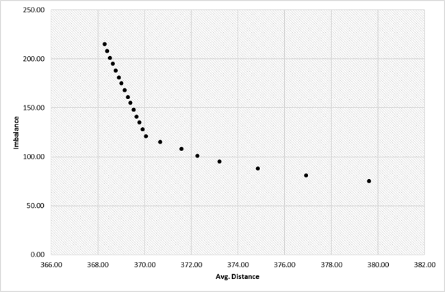 Figure 5 shows the set of Pareto optimal solutions for the case study. It should be noted that the current solution (405.82, 317) is far away from Pareto Frontier. A more in-depth analysis reveals that the current solution is 514.96 distant from Ideal Point (0,0). Through the ε-constraint method, we found 22 non-dominated solutions. The average distance from the Pareto front to the Ideal Point is 400.01, and the distance between extreme non-dominated solutions is 140.46. The average travel distance per container during the loading operations in the Pareto front ranges from 368.30 to 379.63 m, while the imbalance of containers among blocks ranges from 75 to 215 containers.